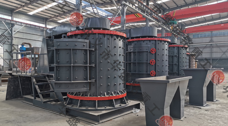 物料由機器上部垂直落入高速旋轉的葉輪內,在高速離心力的作用下,與另一部分以傘狀形式分流在葉輪四周的物料產生高速撞擊與粉碎,物料在互相撞擊后,又會在葉輪和機殼之間以物料形成渦流多次的互相撞擊、摩擦而粉碎,從下部直通排出,形成閉路多次循環,由篩分設備控制達到所要求的成品粒度。